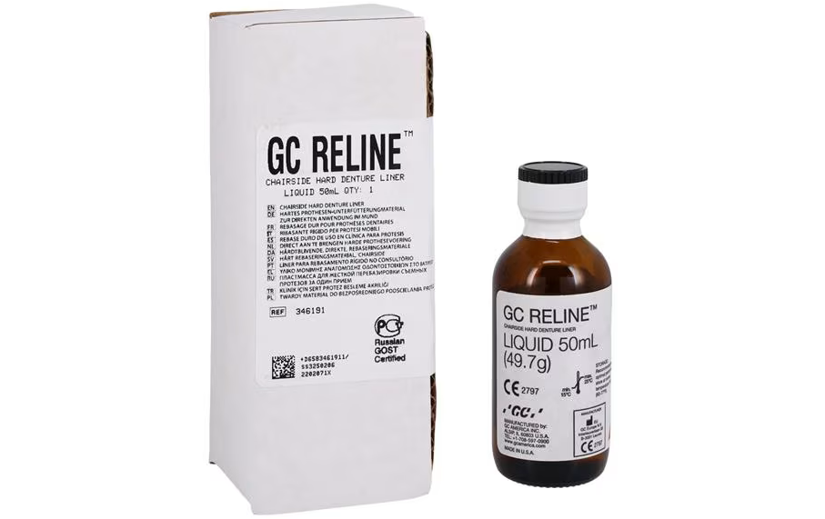 When mixed with GC Reline™ Powder, GC Reline™ Liquid is a methyl methacrylate free, self-curing silicone reline material that does not exhibit the high exothermic heat and pungent odor present in other acrylic, resin reliners. This product cures completely in the patient’s mouth within 5 minutes, minimizing potential removal distortion. GC Reline can also be used to extend denture borders.