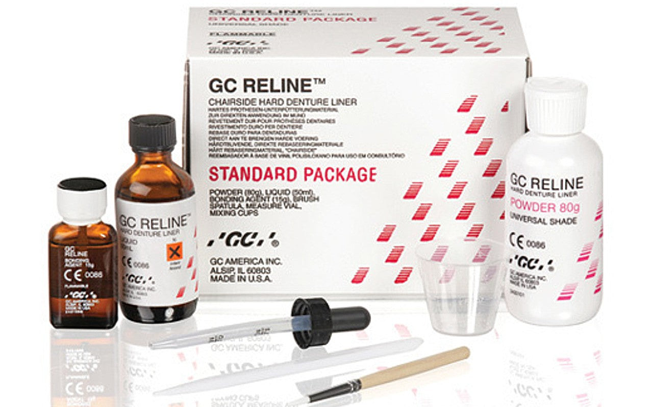 GC Reline™ Hard Denture, Chairside Reline Material is an improved methyl methacrylate free, self-curing silicone reline material that does not exhibit the high exothermic heat and pungent odor present in other acrylic, resin reliners. This product cures completely in the patient’s mouth within 5 minutes, minimizing potential removal distortion. GC Reline can also be used to extend denture borders.