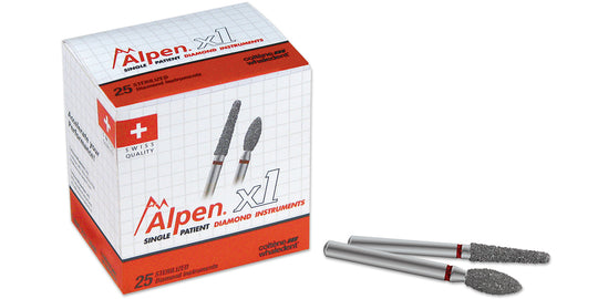 Alpen® x1 diamond instruments are disposable, individually wrapped and gamma-sterilized to minimize the risk of cross contamination. Swiss quality and precision in a single-use package Each bur uniformly coated with natural diamonds Friction grip (FG) standard...Regular price From $51.50Regular price From $51.50 -