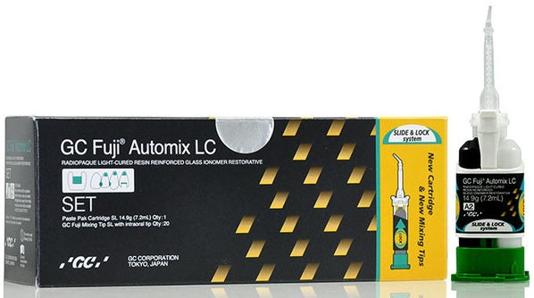 The GC Fuji Automix LC is a resin-reinforced glass ionomer restorative with an ergonomic dispenser. It is used for the optimal restoration of primary teeth, class III and V restorations, core build up, and as a base or liner under composite restorations.