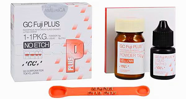 GC Fuji PLUS™ is a resin-reinforced, glass ionomer luting cement designed for final cementation of metal, porcelain-fused-to-metal, metal-free crowns, bridges, inlays and onlays. It bonds chemically and mechanically to tooth structure and all types of core material.