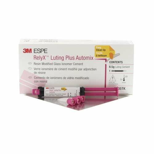 Relyx™ Luting Plus Automix is a resin modified glass ionomer cement that is used as a dental adhesive primarily for metal crowns, inlays and onlays, porcelain-fused-to-metal (PFM) crowns and bridges, all-alumina or all-zirconia strengthened core ceramic restorations (such as Lava™ or Procera®), final cementation of PFMs, metal crowns, all-alumina, and orthodontic bands and appliances. Automix is a self-mixing syringe delivery system.