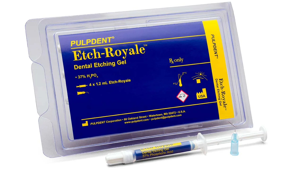 Etch-Royale™ 37% Phosphoric Acid Etching Gel is a creamy gel that readily settles into dentin and enamel, but does not run. The darker blue color is easy to see in thin applications. Etch Royale has all the same features as Etch-Rite, but the consistency is slightly creamier than its famous sister product.