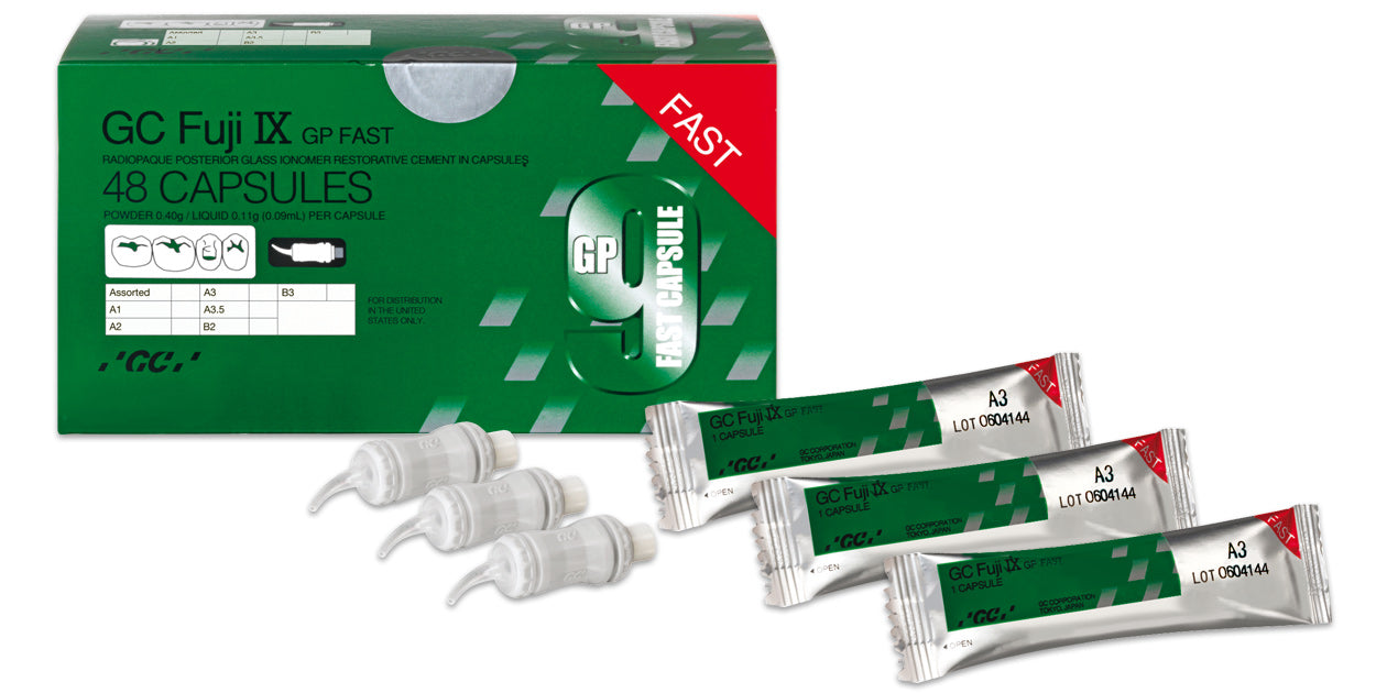 A restorative cement made from the same glass ionomer material as the GC Fuji IX™ GP only with 1-1/4 minute working time and 3-minute set time.