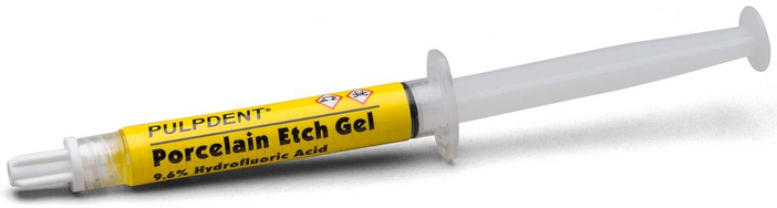 Pulpdent Porcelain Etch Gel is a 9.6% hydrofluoric acid gel for etching porcelain crowns, veneers and inlays or for etching fractured porcelain surfaces prior to cementation or bonding with resins and resin cements. It can also be used to etch hybrid composites.