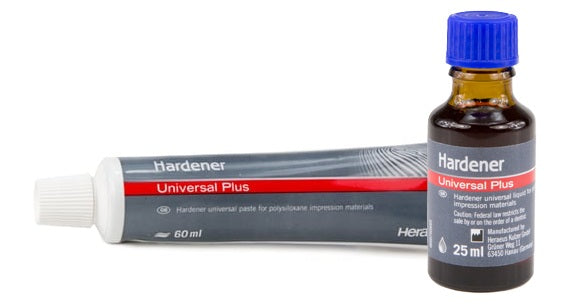 CutterSil® Universal Hardener Plus Liquid is used with CutterSil® Putty Plus for for crowns, bridges, inlays, onlays and partial and full edentulous impressions. Contaminants from gloves or other reaction materials do not affect setting time.