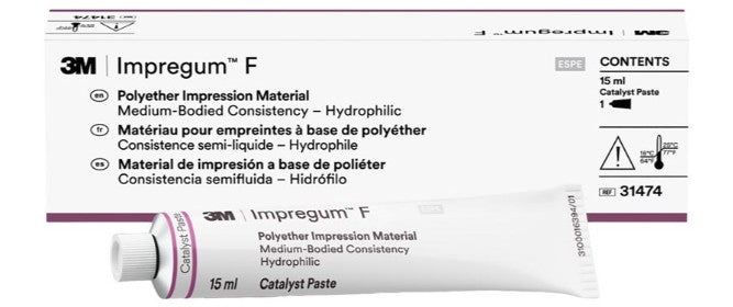 3M™ Impregum™ F Impression Material is designed for dentists who prefer a hand-mix formulation and a monophase technique. This medium body polyether dental material delivers high-precision impressions and is especially well suited for implant and functional impressions.