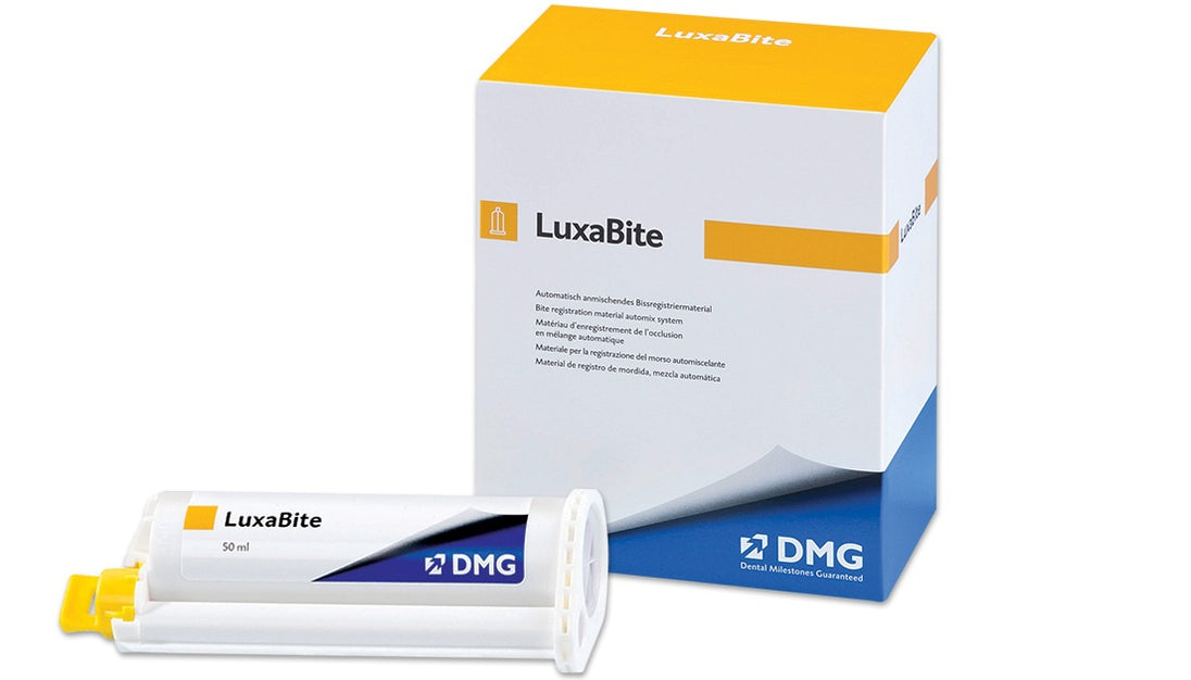 LuxaBite™ is a bisacryl bite registration material that captures accurate and stable bite registrations with a set time of 2 – 2:30 minutes after start of mix and 4 minutes after removal from mouth.