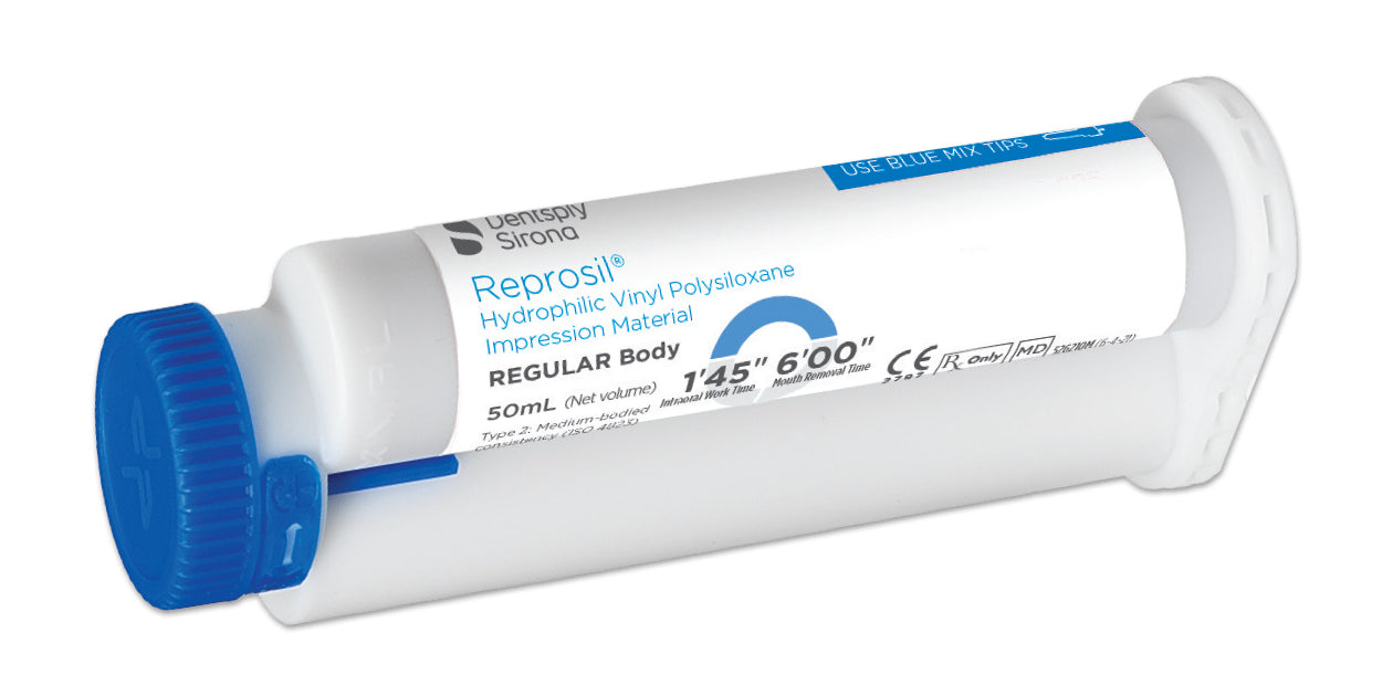 Reprosil® is a hydrophilic vinyl polysiloxane impression material that provides excellent dimensional accuracy and stability for a variety of crown, bridge and edentulous impressions. It may also be used for precise duplication of models in a laboratory setting.