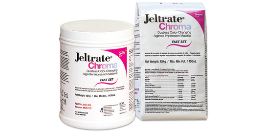 Formulated to change colors for each preparation phase 5-day dimensional stability 2-minute Fast set Easy mixing Nonslumping Consistent mix provides smooth models Intro Kit Contains: 1 (454 g) pouch Jeltrate® Chroma material, 1 canister, 1 water measure...Regular price From $28.05Regular price From $28.05 -