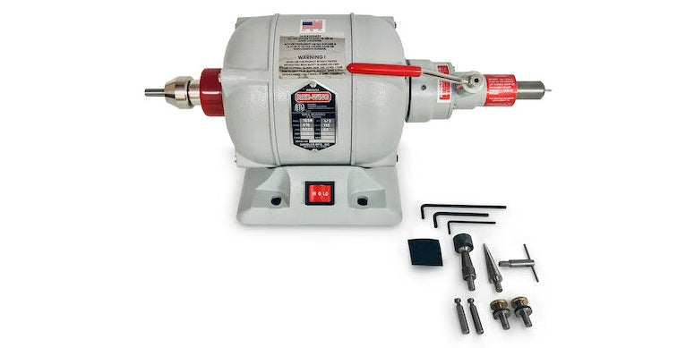 Factory-installed to the right side of a 26A Low Base, Red Wing Lathe.This combination provides the technician with the ultimate in chuck changing efficiency at both low and high lathe speeds. The movement of the activating handle allows the technician to change from 1/4" to 3/32" burs, mandrels and chuck accessories without stopping the lathe.