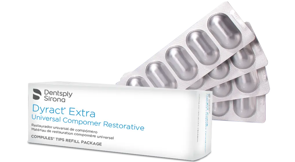 Dyract® eXtra is a compomer light-curing filling material for all classes of anterior as well as posterior cavities. Dyract® eXtra fillings release fluoride ions continually and function as acid-buffers along the interface with the tooth structure.