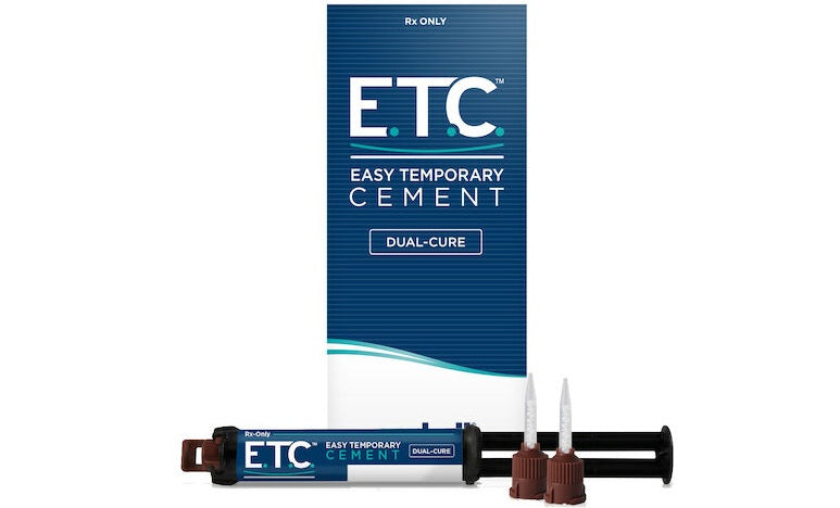 E.T.C.™ is a resin-based, dual-cure, temporary dental cement that contains triclosan. It is indicated for short to medium-term cementation of dental prostheses to enamel, dentin, cementum, amalgam, metal alloys, ceramics, composite cores or implants. It is translucent so that it blends well with tooth roots and crown margins, making it especially useful in anterior regions of the mouth.