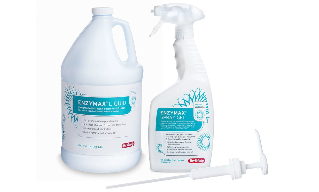 Enzymax® is a dual enzyme ultrasonic detergent specifically formulated for efficient ultrasonic cleaning or pre-soaking of cassettes and instruments. This cleaning solution contains Steelgard agents to protect instruments from harmful minerals naturally found in water that contribute to buildup, spotting and corrosion.