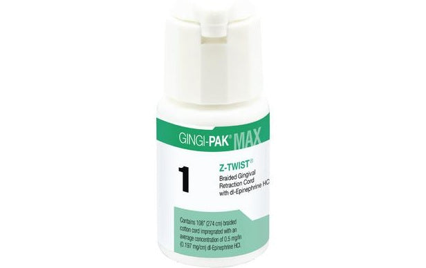 Gingi-Pak® Z-Twist™ Weave Braided Medicated Retraction Cord has a unique non-split, collapse-resistant and braided construction of 100% cotton that provides excellent, dependable handling characteristics. It packs easily, remains in place, and has a tight weave that resists penetration by even the smallest packing instruments.
