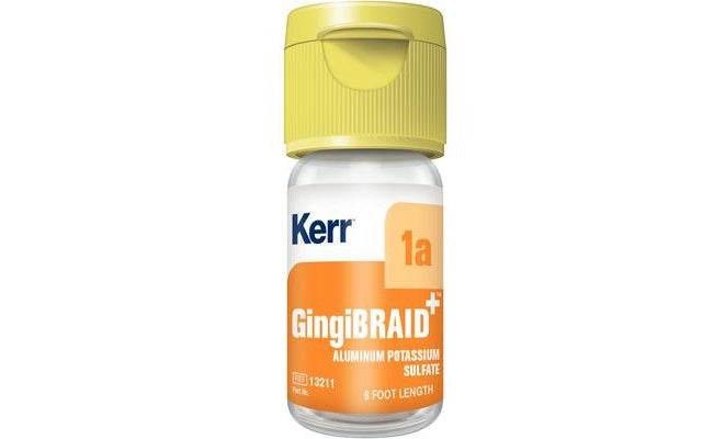 GingiBRAID+ Braided Retraction Cord – specially treated braid for faster absorption, allowing immediate use and effectiveness. Braided retraction materials are made of cotton fiber that will not split or collapse in the sulcus. The retraction braids have a background color (for medicament identification) with a second color to identify diameter. 6 feet (72 inches/183 cm) of braid per bottle.