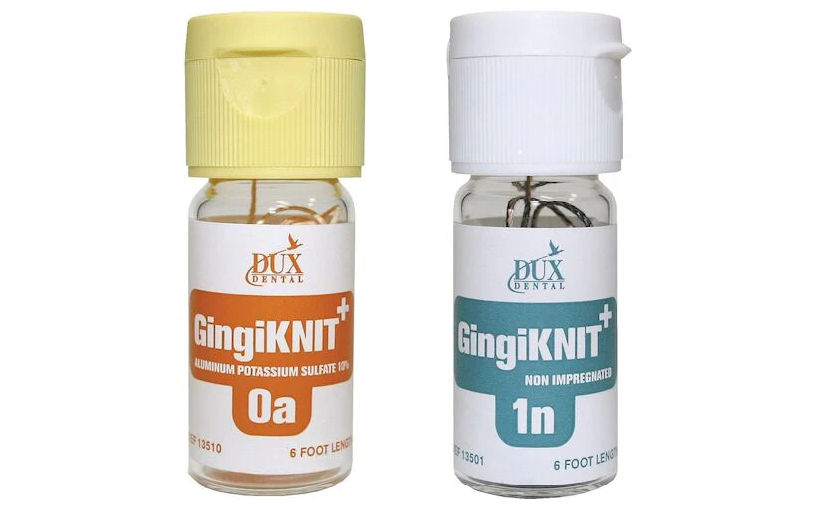Gingiknit+ Aluminum Potassium Sulfate retraction cord is constructed by knitting many tiny loops together to form a long interlocking chain. The Gingiknit+ Aluminum Potassium Sulfate places easily without fraying or memory and conforms to the sulcus with a gentle, outward force. This retraction cord will cut cleanly if touched by a high-speed cutting instrument. Gingiknit+ is also available as non-impregnated.