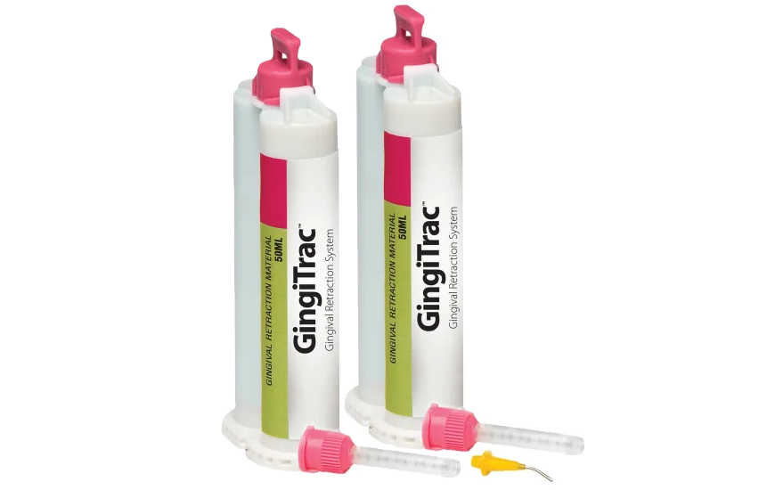 GingiTrac™ is a gingival retraction paste used with a 50 ml automix gun system. Syringe the paste into the sulcus with the NeedleTip™, apply bite pressure with a GingiCap™ and wait 2 minutes.