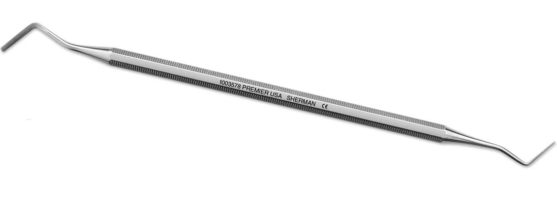 The Sherman Cord Packer Instrument has a very thin flat tip with slightly angled corners. A hoe-like angulation for packing interproximally on one end and a flat spatulating end for packing buccally and labially.