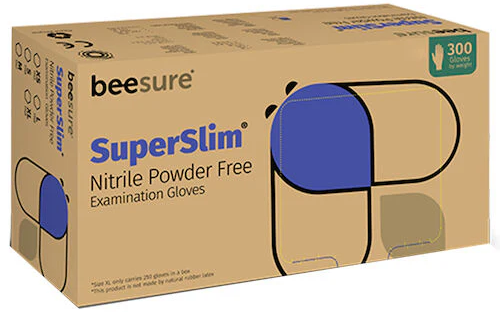 BeeSure SuperSlim™ Nitrile Exam gloves reduce storage space and packaging waste with an space saving slim box.