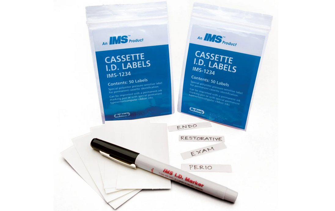 IMS® Cassette I.D. Labels are specially designed polyester pressure-sensitive labels for permanent cassette identification. The IMS® I.D. Marker is a permanent indelible ink marker, ideal for identifying procedural setups and for use on I.D. Labels or Monitor Tape. IMS® Cassette Color Tabs are silicone tabs that fit on cassette lids and are used for identifying cassette procedure by color.