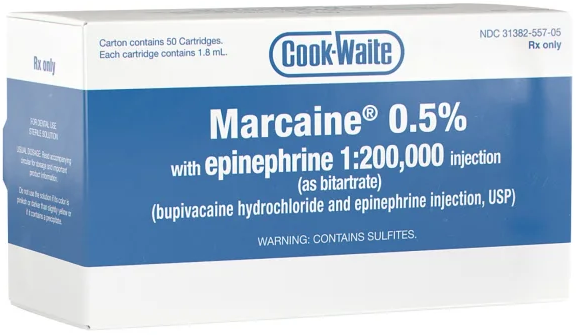 Cook-Waite Marcaine® is a latex-free, long acting local anesthetic used during longer dental procedures such as extractions and endodontic treatment. It may be administered by infiltration injection or nerve block.