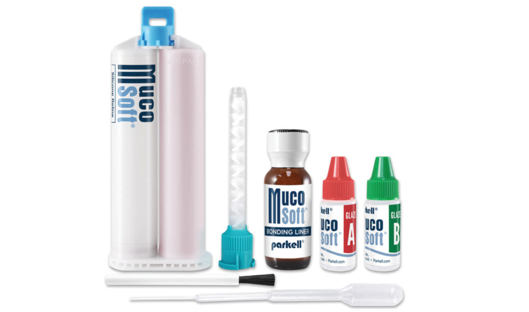 Standard Kit Contains: 1 (50 ml) cartridge of MucoSoft Reline Silicone, 1 (15 ml) bonding liner, 1 (12 ml) glaze, mixing tips, brushes and pipettes