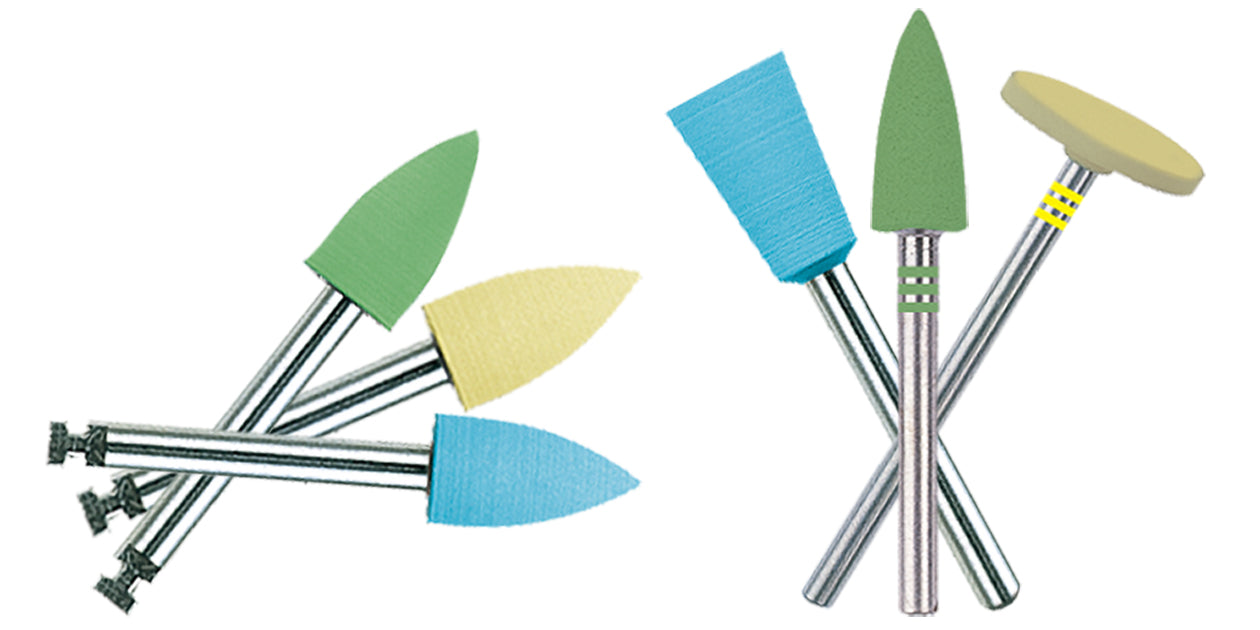Diamond impregnated polishing system restores natural shine to porcelain and eliminates re-firing. Autoclavable. The natural caoutchouc bonding absorbs heat to help prevent damage to zirconia and other high-performance ceramics. Recommended speed: 5,000-7,000 rpm.