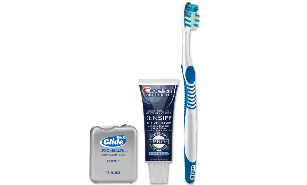 Contains: 1 Oral-B® Deep Clean toothbrush, 1 x 0.85 oz. tube Crest® Pro-Health™ Densify™ Pro toothpaste, 1 x 4m Oral-B® Glide® Pro-Health™Deep Clean floss