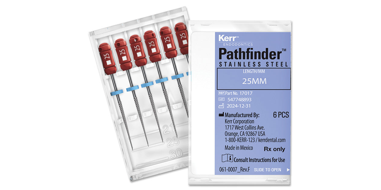 Pathfinder™ Stainless Steel Endo Hand Files feature a minimal taper and are used for negotiating difficult or calcified canals. These files are approximately a size 7.