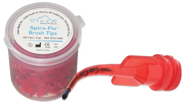 Spira-Flo™ Brush Tips have a curved cannula, with an internal spiral channel and adjustable length fiber bristles to provide optimal mixing and controlled delivery of viscous restorative materials.