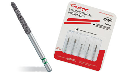 Two Striper® Diamond Burs utilize P.B.S.® bonding that maximizes the exposure of diamond cutting surfaces, especially at the tips and upper circumference of the diamond instrument where most cutting occurs. Crystals placed evenly and precisely in a uniform matrix are fused permanently to a surgical-grade, stainless steel shank so they are guaranteed not to fall out.