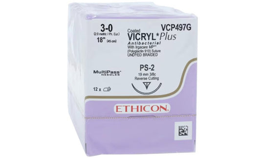 Coated Vicryl (polyglactin 910) suture is a synthetic absorbable surgical suture composed of a copolymer made from 90% glycolide and 10% L-lactide. It is indicated for use in general soft tissue approximation and/or ligation, including use...Regular price $268.19Regular price $268.19