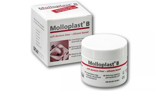 Molloplast-B® is a lab-processed silicone material that is used to created soft denture relinings. Polymerized by microwave Added plaque inhibitors Strong bonding with existing dentures or new dentures Can be polymerized simultaneaously with acrylatesRegular price $198.05Regular price $198.05 -