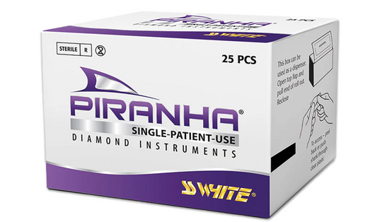 Piranha® Diamond instruments are single-use burs designed to increase office efficiency and clinical effectiveness by using a new diamond for each procedure. These single-patient use diamonds are essentially disposable drill bits (rotary instruments) attached to a...Regular price $77.50Regular price $77.50