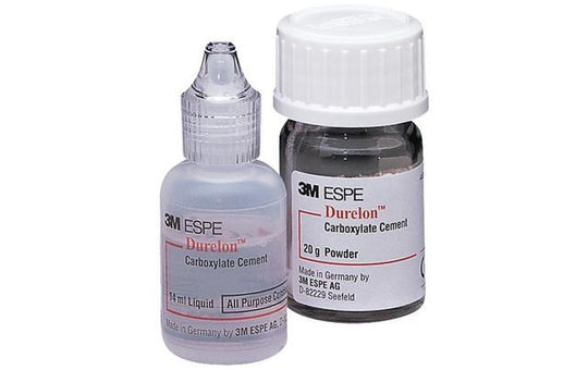 Carboxylate luting cement. A fluoride-releasing, hand-mix cement with a relatively neutral pH value that reduces post-cementation sensitivity. Low film thickness for better fit and marginal integrity of crowns and bridges. 3M™ Durelon™ liquid is packaged in syringe-like calibrated...Regular price From $154.69Regular price From $154.69 -
