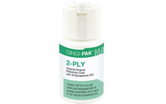Retraction cords in Gingi-Pak 2 Ply and Crown-Pak 4 Ply are loosely wound so that the strands may be separated, twisted or combined to make them ideal for use in the gingival sulcus regardless of the...Regular price From $15.97Regular price From $15.97 -