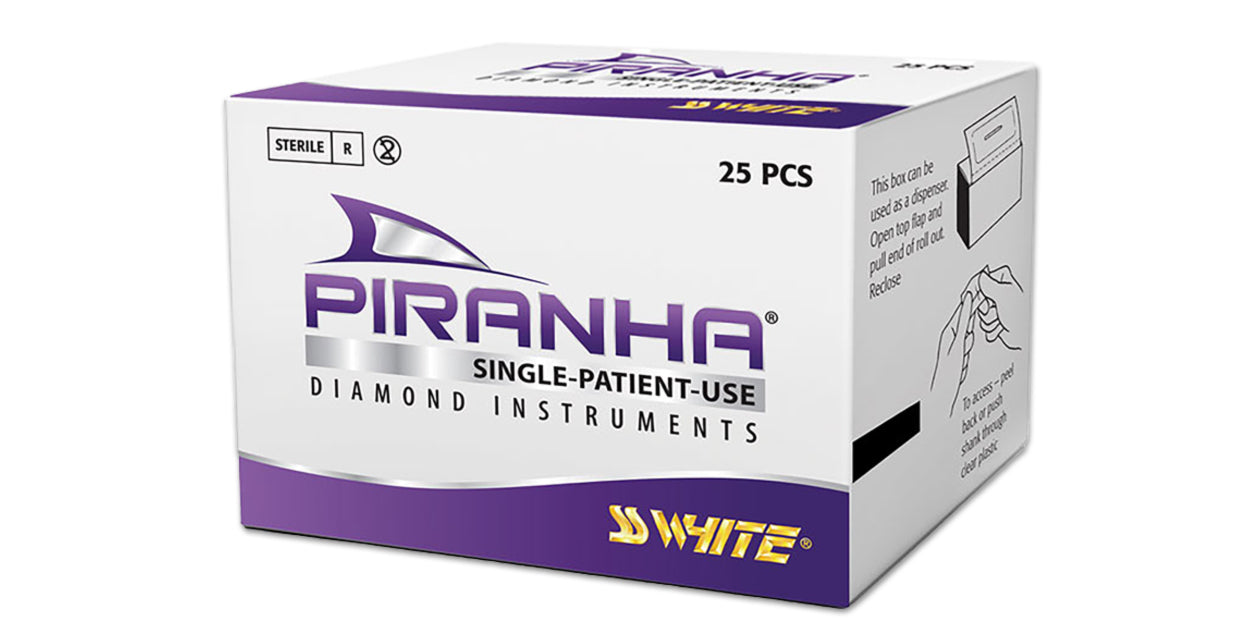 Piranha® Diamond instruments are single-use burs designed to increase office efficiency and clinical effectiveness by using a new diamond for each procedure. These single-patient use diamonds are essentially disposable drill bits (rotary instruments) attached to a handpiece and are used by dental professionals to grind down tooth surfaces in preparation for restoration procedures.