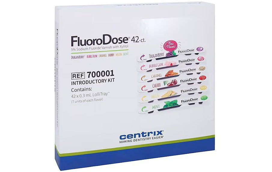FluoroDose® Introduction Kit provides you with an assortment of varnish flavors in Lollipack® packaging. Each Lollipack® includes a single dose (0.3 ml) of varnish plus a Benda® Brush applicator for mixing and application.