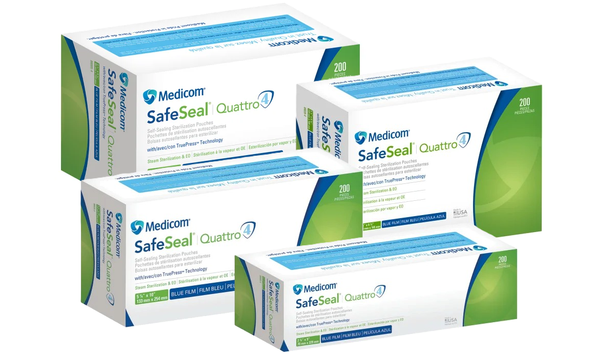 Medicom® SafeSeal® Quattro Self-Sealing Sterilization Pouches have Class 4 internal multi-variable steam and Class 1 external process EO indicators to effectively monitor sterilization.