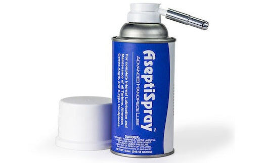 AseptiSpray is a pressurized handpiece cleaner and lubricant that maintains long life and durability of handpieces.