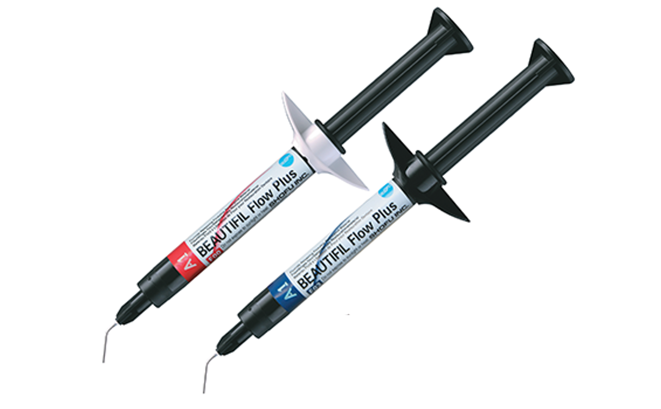 BEAUTIFIL Flow Plus is an injectable hybrid restorative. This composite is indicated for Class I, II, III, IV & V restorations as well as minimally invasive restorations, root caries restorations, filling primary teeth, restoring defects in enamel, additional filling and modification after composite resin filling and undercutting blockouts.