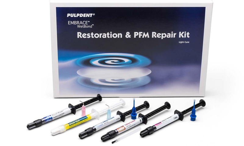 Embrace™ WetBond™ Restoration & PFM Repair Kit is specifically designed for bonding to all restorative, metal and ceramic surfaces. The kit provides unique materials for preparing, priming, opaquing and protecting surfaces, and for sealing, finishing and polishing the final repair or restoration.