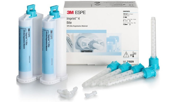 3M™ Imprint™ 4 VPS Bite Registration Material enables fast and accurate bite registrations thanks to its great flow properties, no slump consistency, ample working time and 60-second setting time. Once set, Imprint™ 4 VPS bite registration impressions are easy to cut and trim.