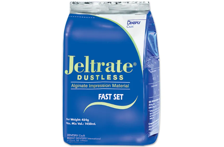 Jeltrate® Dustless Alginate Impression Material is designed for making dental impressions for case study models, orthodontic models and opposing models. It is also suitable for use in the fabrication of casts for most removable partial denture frameworks, removable orthodontic and removable occlusal splint appliances, mouthguards and custom trays.