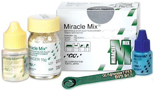For lasting core buildups, block-outs and repair, Miracle Mix offers the formula of glass ionomer cement with 100% fine silver alloy powder.