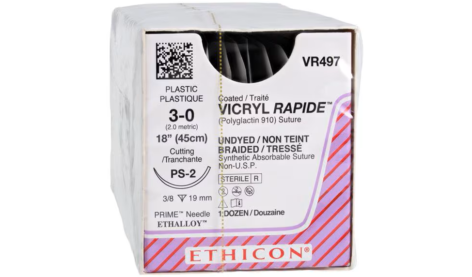 Coated VICRYL™ RAPIDE (polyglactin 910) suture is a synthetic absorbable sterile surgical suture composed of a copolymer made from 90% glycolide and 10% L-lactide. Although this suture is a synthetic absorbable suture, its performance characteristics are intended to model the performance of collagen (surgical gut) suture. It is indicated only for use in superficial soft tissue approximation of the skin and mucosa, where only short term wound support (7-10 days) is required. Coated VICRYL RAPIDE suture is not intended for use in ligation, ophthalmic, cardiovascular or neurological procedures.